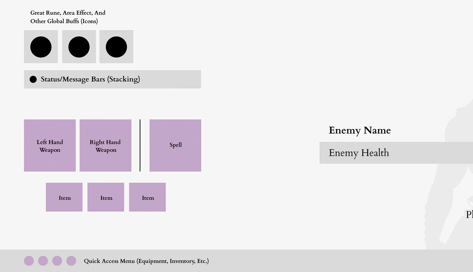 Elden Ring, as many believe, is a masterpiece of a game – while also being the challenge of a lifetime for most players. While participating in a course taught by Ivy Sang, the Director of UX/UI for Diablo IV at Blizzard Entertainment, I had the opportunity to step through a small portion of user research, player profile definition, wireframe creation, and ultimately my take on an evolved version of Elden Ring interface elements.