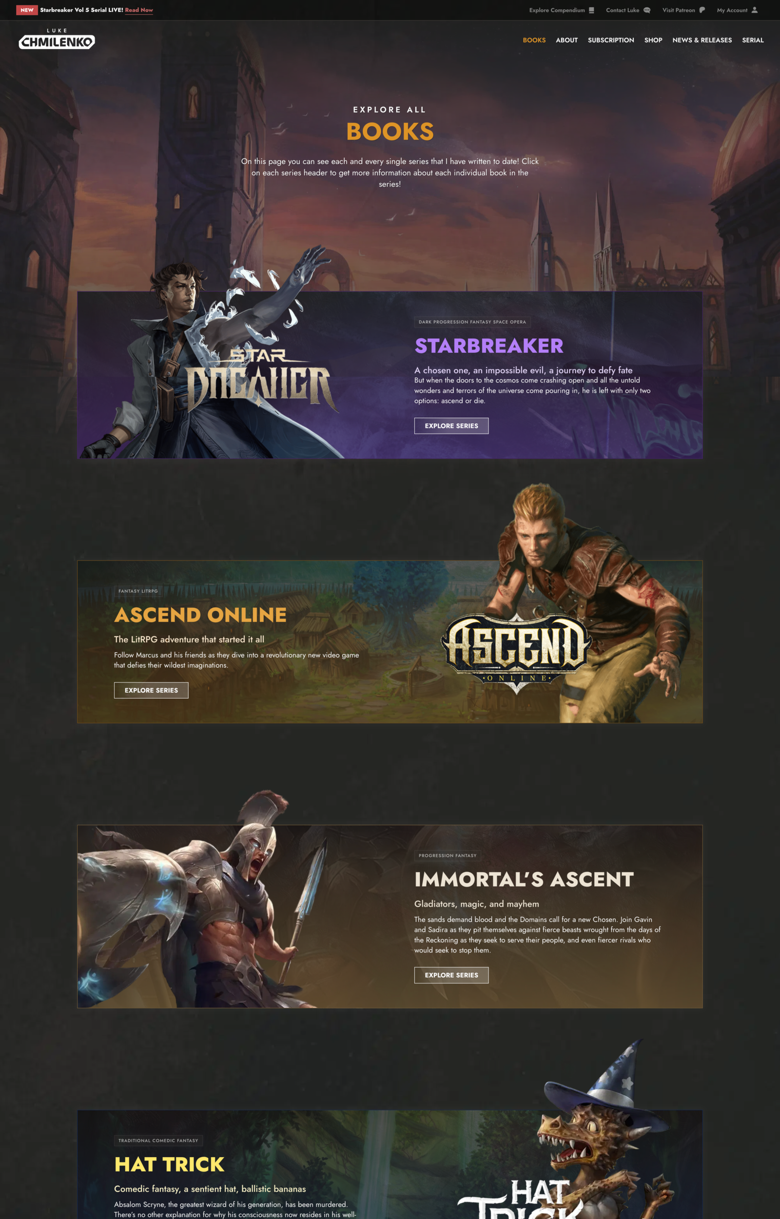 This required a set of functionality that would allow all of his series to be listed with detailed information, books, and how to buy, as well as marketed and presentable for new readers. It also needed to act as an initial landing pad for his baseline subscription service, where users could subscribe monthly to view serial-based content releases.