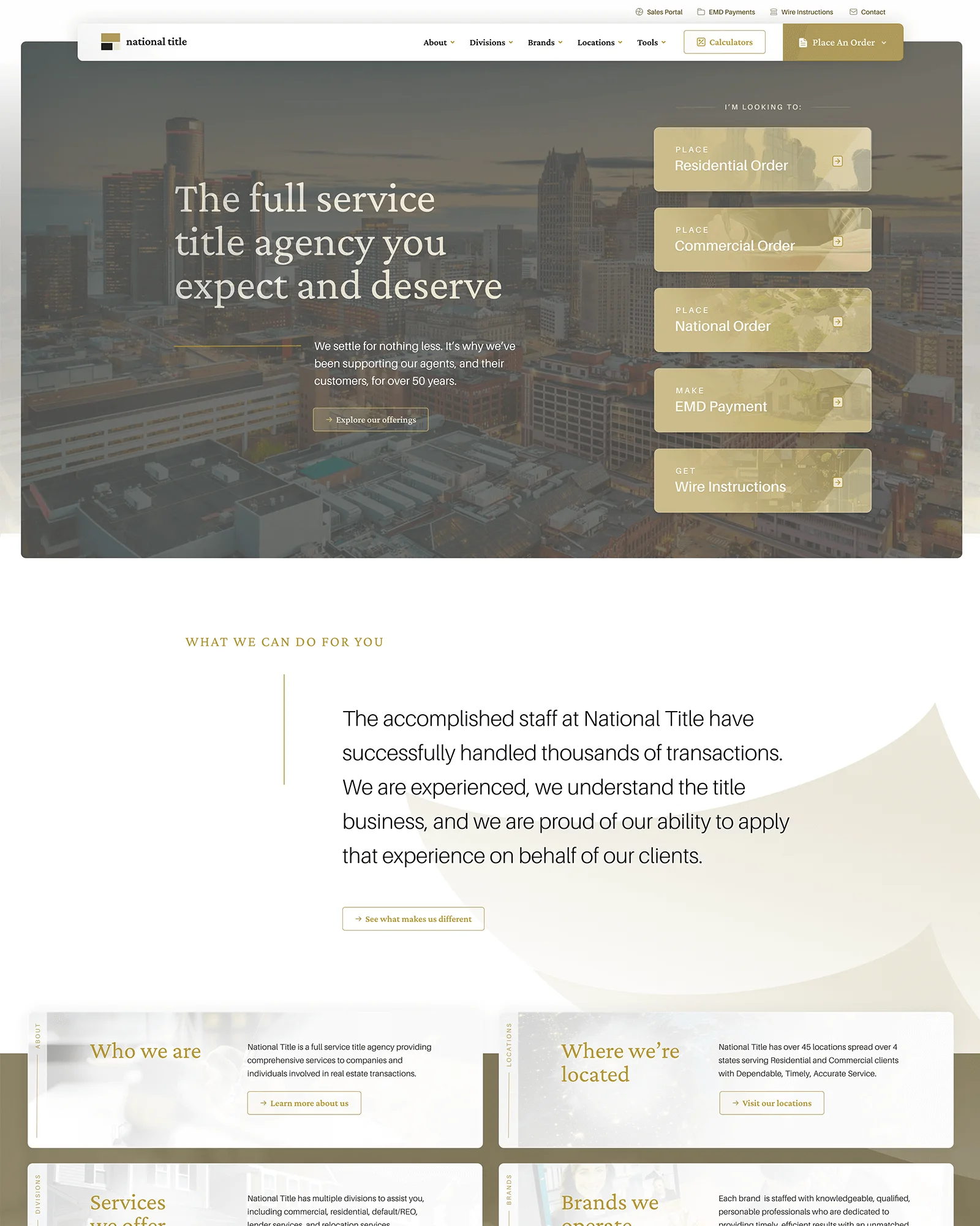 In tandem with a project to reconstruct a popular net sellers calculator for a national title company, I was graciously awarded the proposal to design their new website for their corporate presence. It was an opportunity to invest further in defining key components and styles that matched not only their new branding and calculator application, but now also their entire online presence. This also trickled down into 11 other sub-brand sites, where the design I crafted would be utilized for each (via WordPress child themes), minus specific content and imagery.